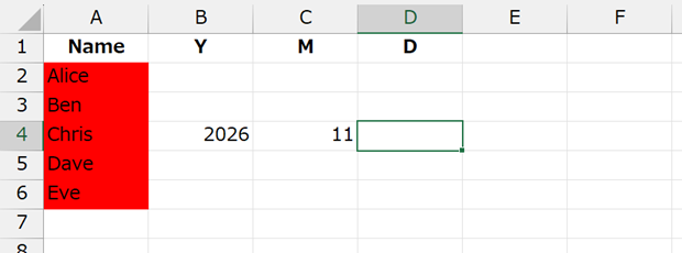 B4:D4セルがすべて入力し終わると、下図のようにA4セルの塗りつぶしがなくなります。