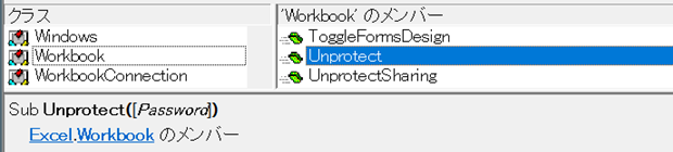 保護の解除を行うには、Workbook.Unprotectメソッドを、使う必要があります。