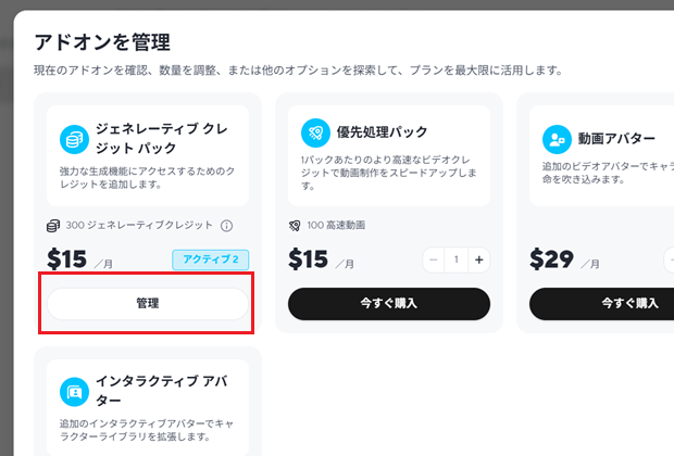 [ジェネレーティブクレジットパック]の[管理]から、