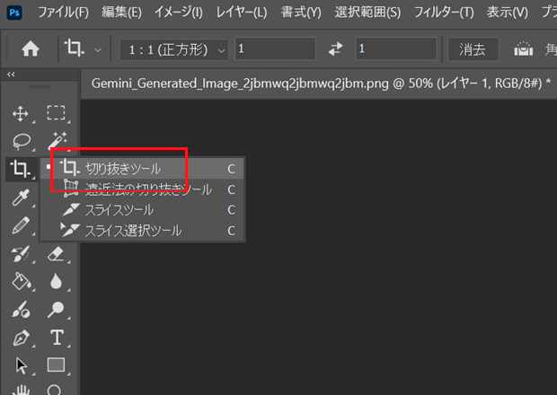 以下の操作を行うことで、切り抜きツールの縦横比固定が解除され、自由に切り抜きができるようになります。