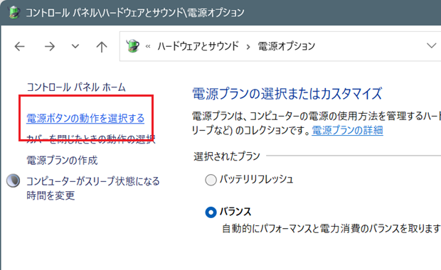 -電源オプション 画面に上がると、下図のような「電源ボタンの動作を選択する」が見えてきます。