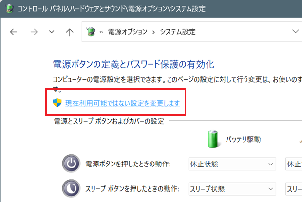 ーシステム設定 画面の「現在利用可能ではない設定を変更します」リンクをクリックすると、