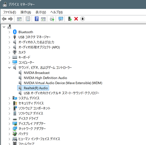音が出なくなっていたときにデバイスマネージャーを確認すると、通常は下図のように表示されているはずの「Realtek(R) Audio」が、
