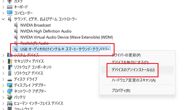 ChatGPTに相談したところ、「インテル スマート・サウンド・テクノロジー」の入れ直しを勧められたので、デバイスマネージャーの「USBオーディオ向けインテル スマート・サウンド・テクノロジー」で右クリックして、[デバイスのアンインストール]をクリック。
