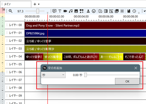 ゆっくりムービーメーカーでは、[空白を追加]コマンドを使うと、