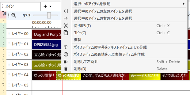 この[空白を追加]コマンドは、メニュー[編集]-[アイテム操作]にもあるのですが、タイムライン上で右クリックすると表示されるショートカットメニューから呼ぶ方が簡単でしょう。