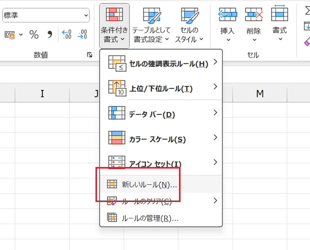 下図のような[ホーム]タブ-[条件付き書式]-[新しいルール]をクリックすると、