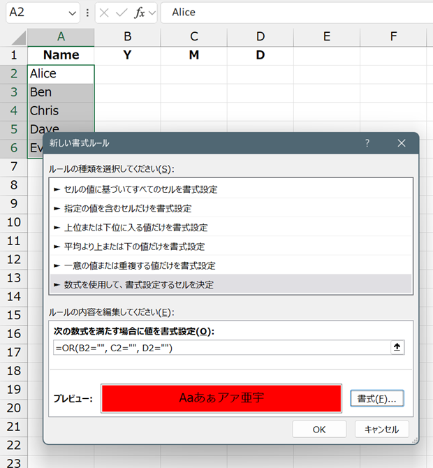 複数のセルが1つでも空白のときに塗りつぶしを行う数式を使った条件付き書式の設定方法