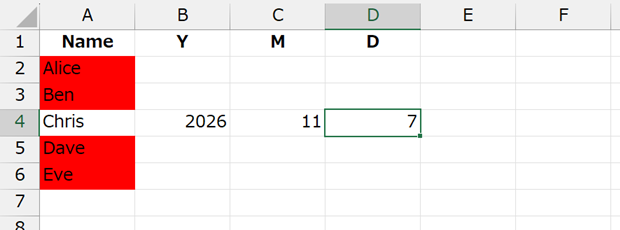 B4:D4セルがすべて入力し終わると、下図のようにA4セルの塗りつぶしがなくなります。