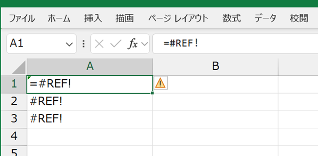 A1セルと、A2・A3セルは微妙に異なりますが、いずれも#REF!エラーの状態です。