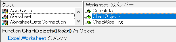 Worksheetオブジェクトに用意されているChartObjectsメソッドで、