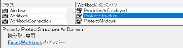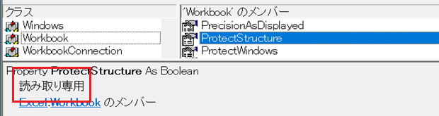 Workbook.ProtectStructureプロパティは、オブジェクトブラウザーの詳細ペインに「読み取り専用」と表示されているとおり、