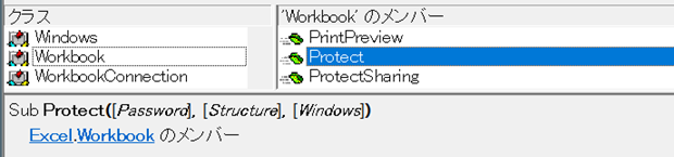 ブックの保護を行いたい場合には、Workbook.Protectメソッドを、