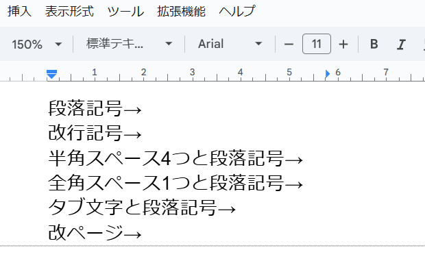 Wordの場合、全角スペースも表示されますが、Googleドキュメントでは全角スペースについては何も表示されません。