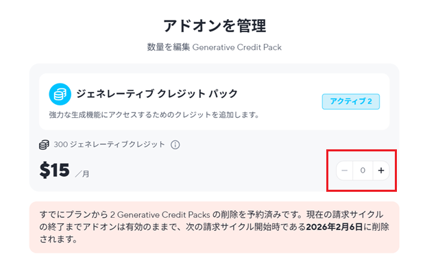 [アドオンを管理]画面を表示してでジェネレーティブクレジットを「0」にする必要があります。