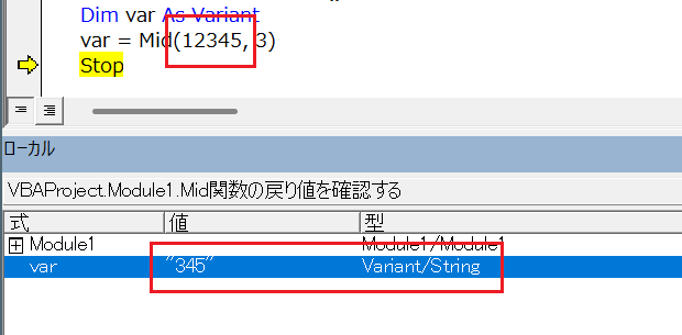 Stopステートメントで中断した状態でローカルウィンドウを確認すると、下図のように[型]欄には「Variant/String」と表示されます。