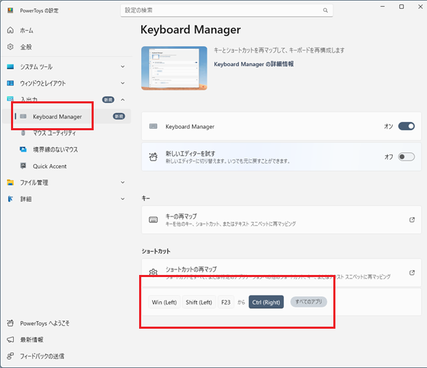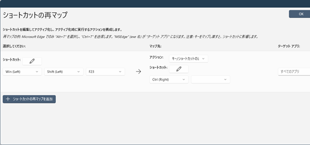[PowerToysの設定]-[Keyboard Manager]-[ショートカット]欄で下図のような状態にしています。