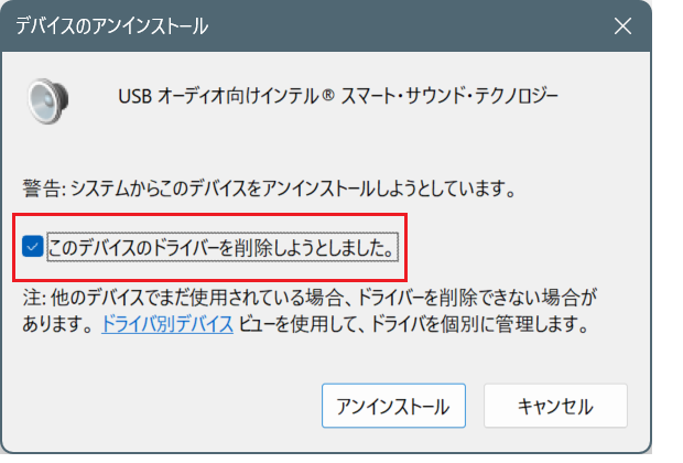 次に表示された、[デバイスのアンインストール]ダイアログ-[このデバイスのドライバーを削除しようとしました。]チェックボックスをOnにして、