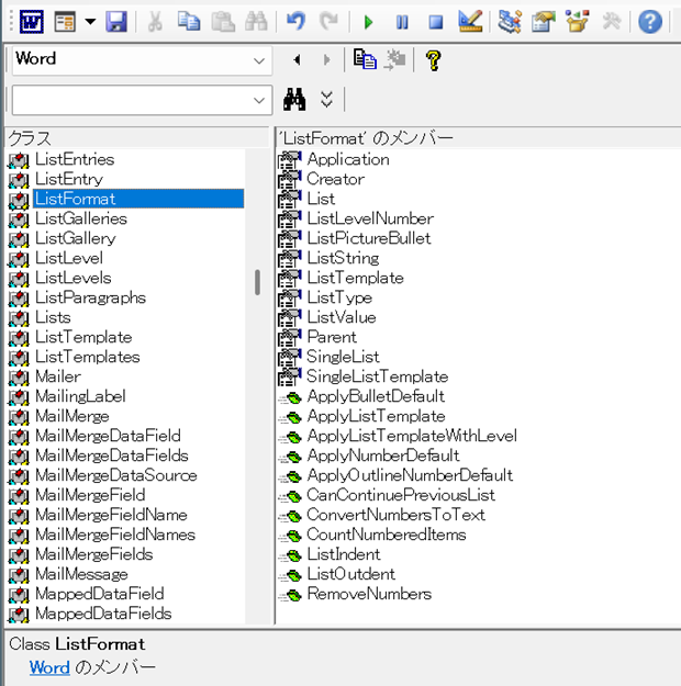 Word VBAには、箇条書き書式を表すListFormatオブジェクトが用意されています。