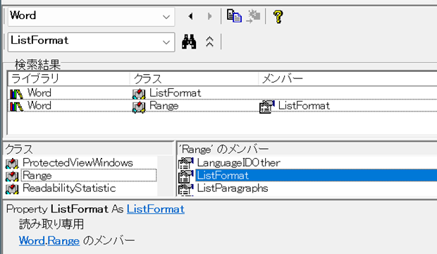 このListFormatオブジェクトを取得する、ListFormatプロパティは、Rangeオブジェクトにしか用意されていないので、