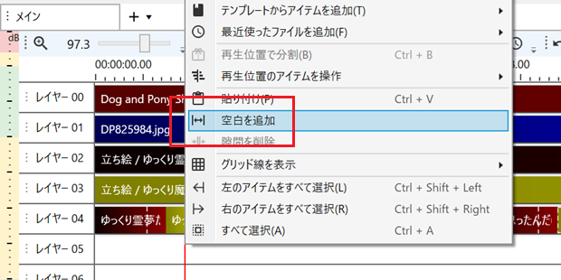 この[空白を追加]コマンドは、メニュー[編集]-[アイテム操作]にもあるのですが、タイムライン上で右クリックすると表示されるショートカットメニューから呼ぶ方が簡単でしょう。