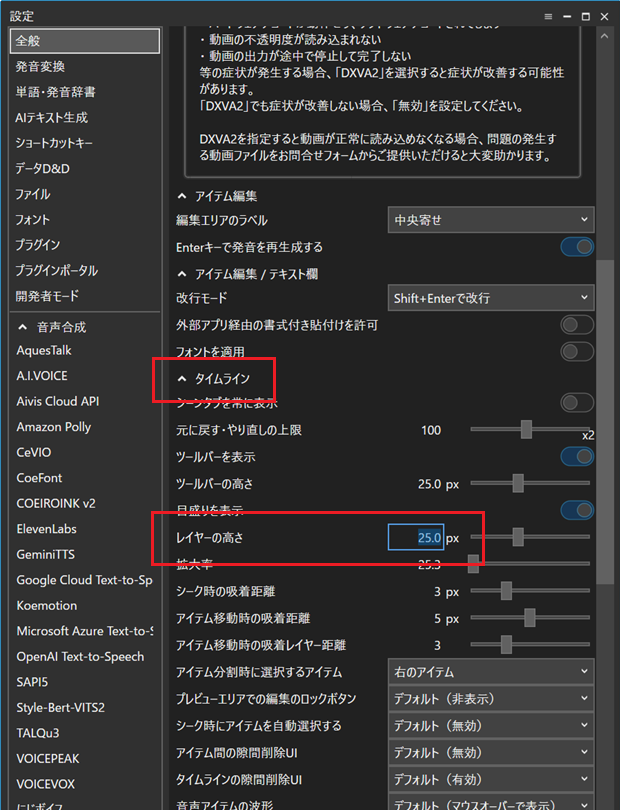 [設定]ダイアログ-[設定]タブ-[タイムライン]グループ内の[レイヤーの高さ]で、数値を入力したりすることで高さを目視確認しながら変更できます。