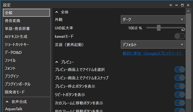 もちろん、メニュー[ファイル]-[設定]から表示できる[設定]ダイアログでも設定できるのですが、