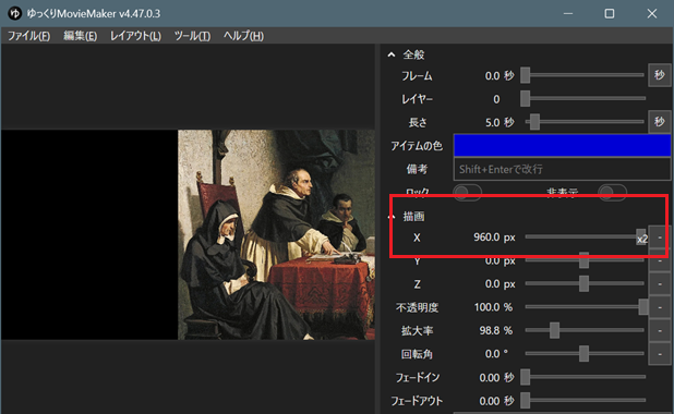 画像を最初の位置に移動して、下図のように最初のX値「960」を覚えておきます。