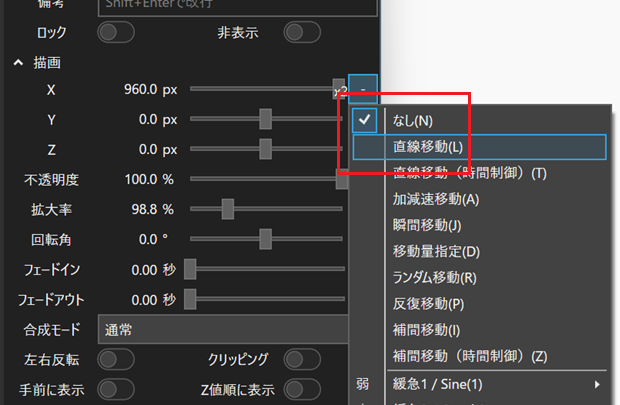 次に、下図のように「なし」から、「直線移動」に変更します。